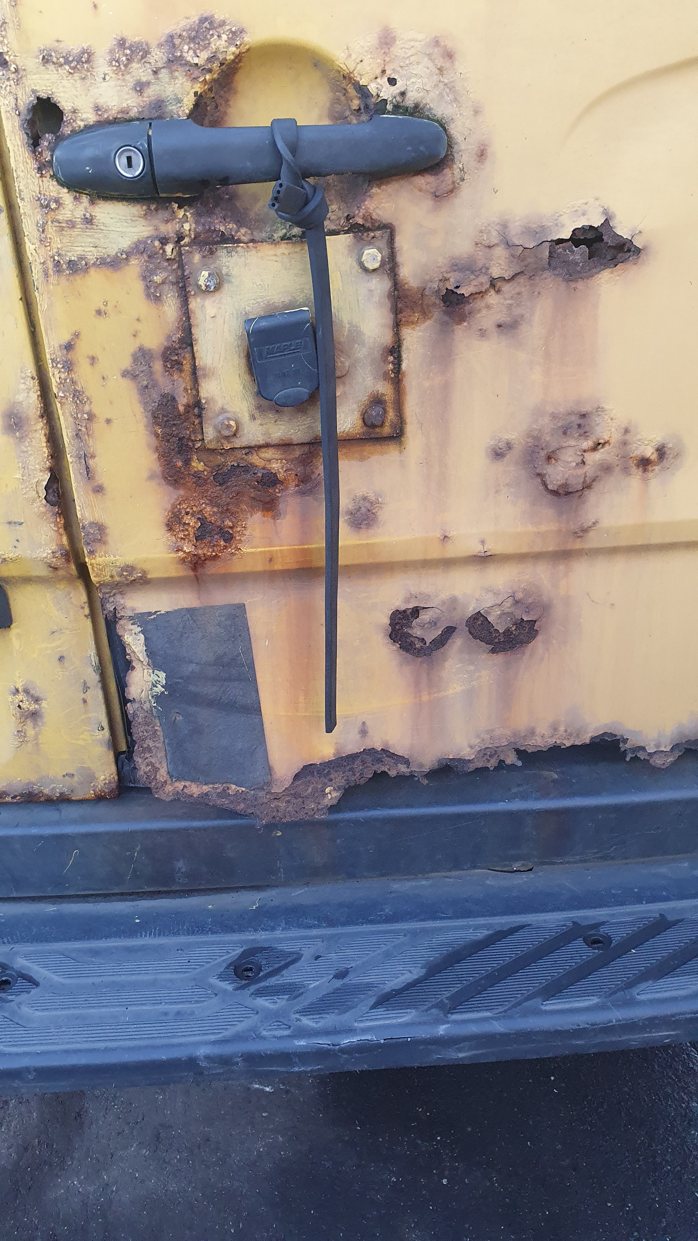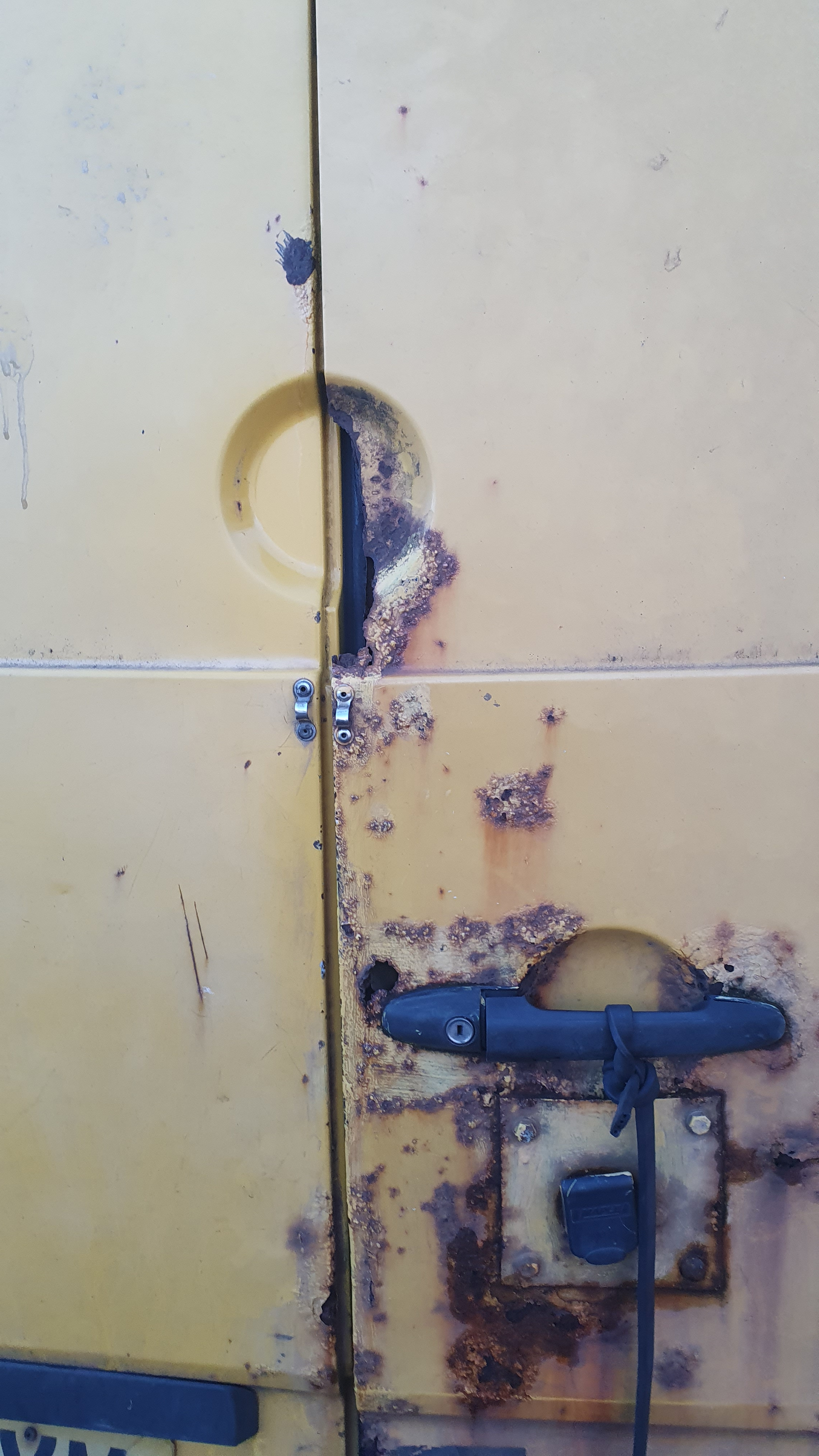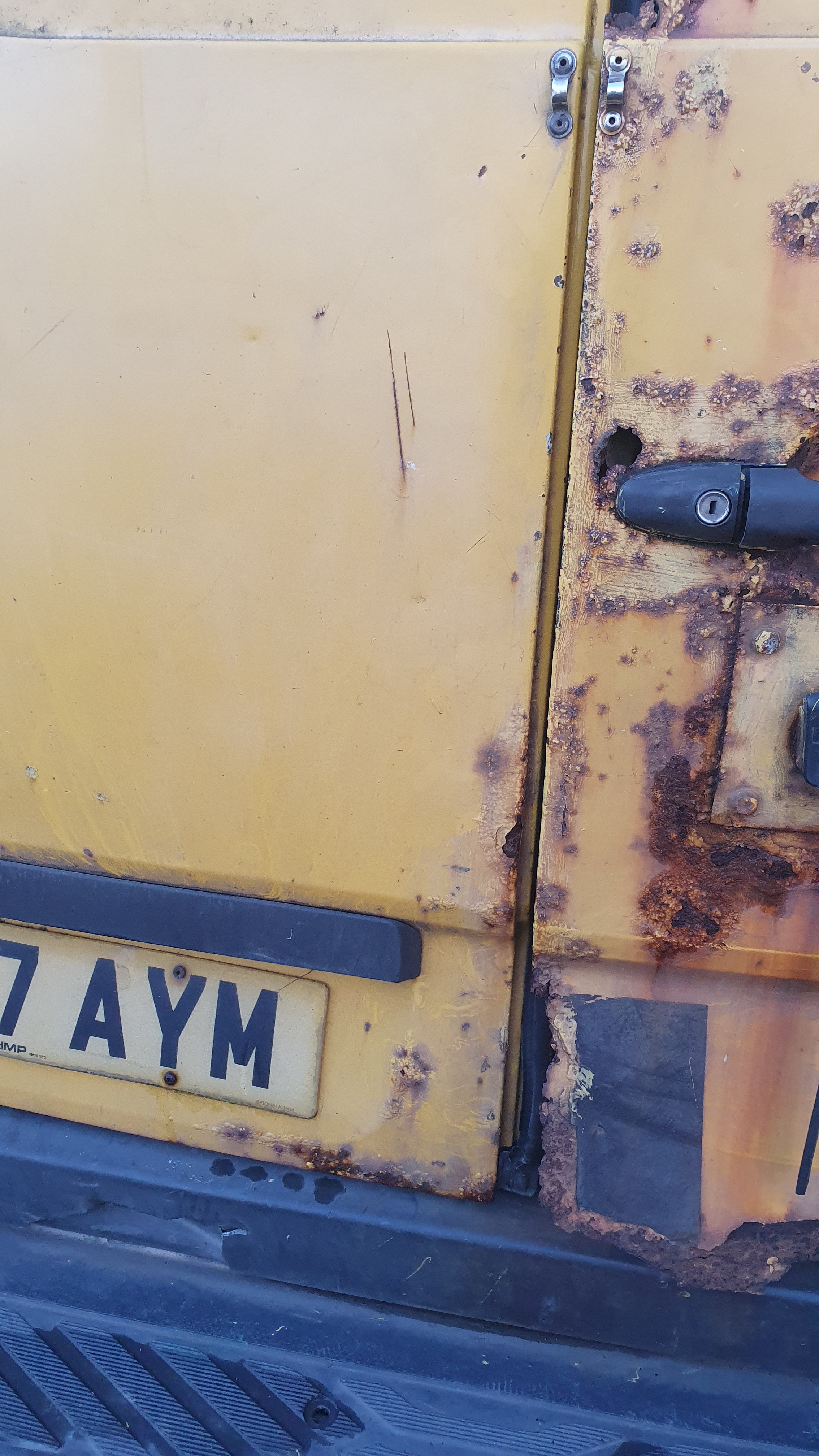O/s/rear door, rust on every panel, o/s/front mirror, o/s wing, front bumper missing, front crash bar, n/s wing, n/s/front door, n/s/rear sliding door, n/s quarter panel, general wear and tear.